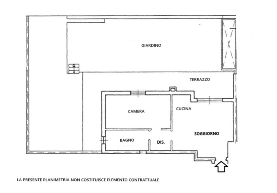 Immobile composto da: Ingresso diretto nella zona giorno in open-space sulla cucina con uscita sullo spazio esterno con giardino. Disimpegno con angolo ripostiglio, bagno padronale e camera matrimoniale dalle generose metrature.