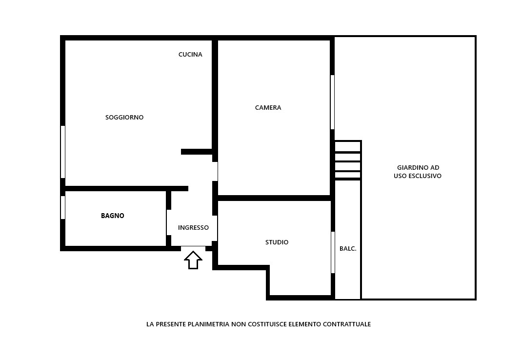L’immobile è composto da disimpegno di ingresso, studio con uscita sulla parte esterna, camera matrimoniale, soggiorno con cucina a vista e bagno.
