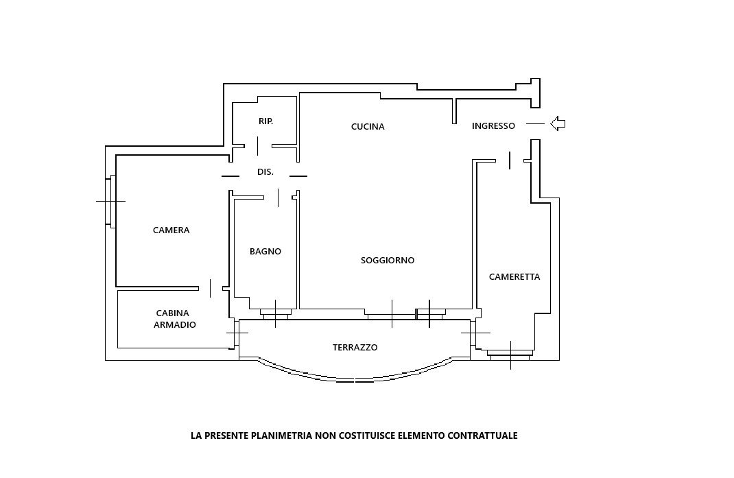 L’immobile è composto da: ingresso, ampio soggiorno con cucina a vista e comoda uscita sul terrazzo, cameretta, disimpegno che ci conduce alla zona matrimoniale composta da un ampio ripostiglio adibito a zona lavanderia, bagno padronale completamente rifatto lo scorso anno e ampia camera matrimoniale completa di cabina armadio.