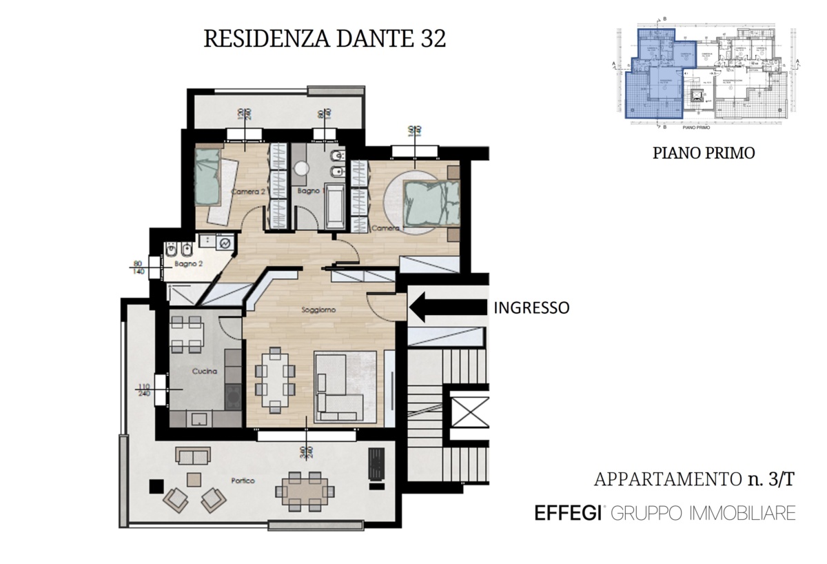 Appartamento 3T PIANO PRIMO: 3 LOCALI al piano primo con ampio terrazzo coperto di Mq. 35, composto da soggiorno, cucina abitabile, disimpegno notte con camera matrimoniale, cameretta con balcone e doppi servizi finestrati. Ampia cantina compresa nel prezzo.