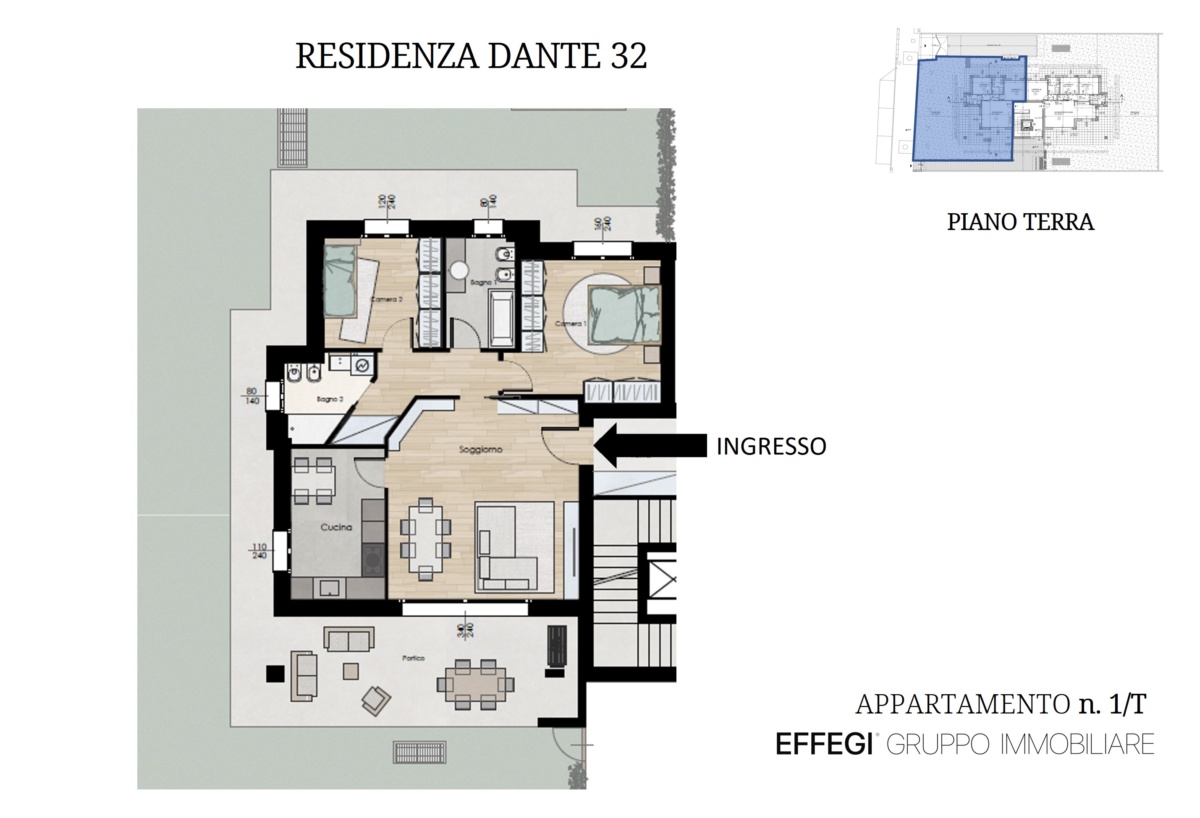 Appartamento 1T PIANO TERRA: 3 LOCALI al piano terra con ampio giardino di Mq. 230 su tre lati, composto da soggiorno con cucina abitabile, disimpegno notte con camera matrimoniale, cameretta e doppi servizi finestrati. Ampia cantina compresa nel prezzo.