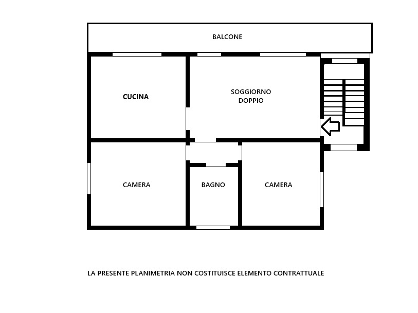 L’ingresso dell’abitazione si apre su un soggiorno doppio con un’ampia balconata che collega la cucina abitabile dalle generose metrature, due camere da letto, disimpegno e il bagno. Ampio giardino di 80 mq.