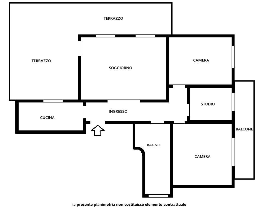 Soluzione così composta: ampio ingresso che ci conduce alla zona giorno distribuita da soggiorno con tre punti finestrati con accesso diretto al terrazzo di Mq 42, cucina abitabile anch’egli con accesso diretto sul terrazzo. Disimpegno zona notte che ci dà la possibilità di accedere al bagno padronale, alle due camere matrimoniali di cui una con affaccio su un ulteriore balcone ed infine la terza camera studio.