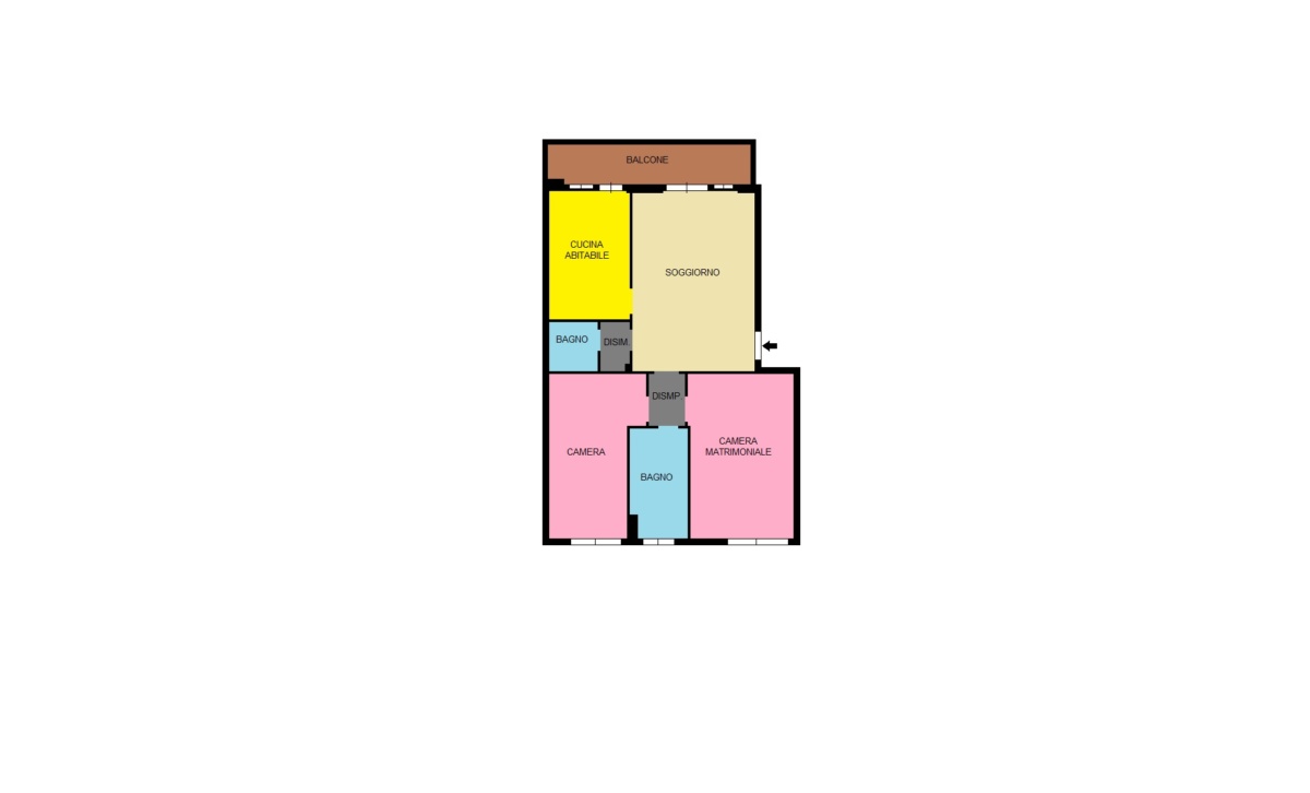 L’immobile è composto dall’ingresso diretto nella zona giorno costituita dallo spazioso soggiorno con camino e cucina abitabile, entrambi con accesso alla comoda balconata, e da un pratico bagno di servizio con box doccia.