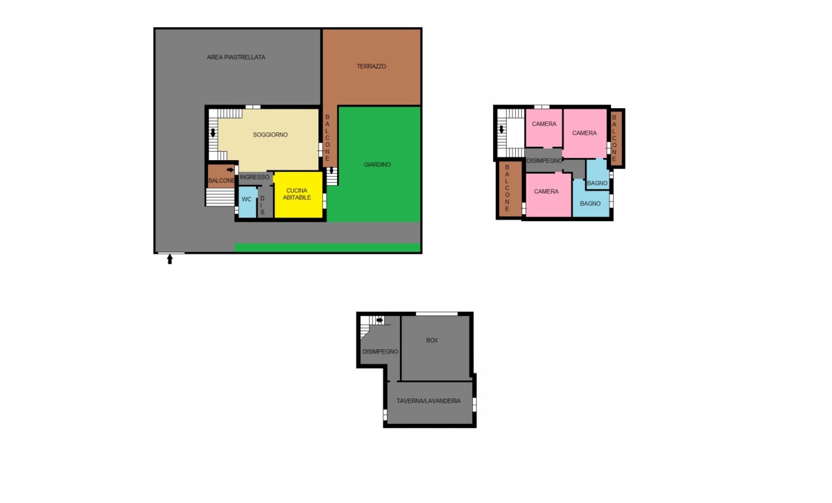 Completano la proprietà il piano seminterrato costituito da un locale taverna/lavanderia e dall’accesso ai due box rispettivamente di 31 e 34 mq.