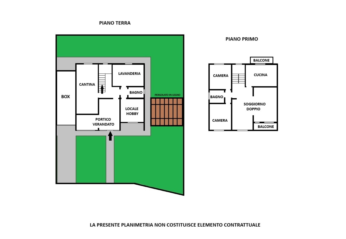 Al piano terreno sono presenti locali accessori estremamente funzionali, tra cui un grande locale cantinato, una comoda lavanderia, un bagno di servizio e un locale studio ideale per chi desidera uno spazio dedicato a hobby personali. Sempre al piano terreno, un ampio portico verandato valorizza e disimpegna l’ingresso dell’abitazione, offrendo una zona protetta e accogliente anche nei mesi più freddi. Completa la proprietà un ampio box di Mq. 26 con ingresso carraio dedicato.